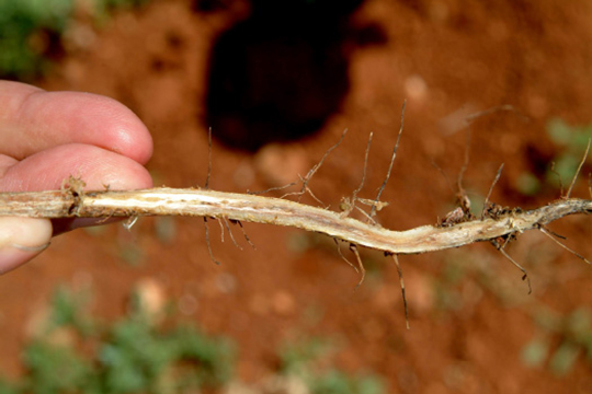 Fusarium wilt of chickpea is caused by the soil-borne fungal pathogen Fusarium oxysporum f. sp. ciceris, which can survive in soil for many years without a host plant. Yield losses of up to 60% have been reported in countries overseas. Chickpea is the primary host of this disease, but other legumes such as pigeon peas, lentils and field peas can also be affected.