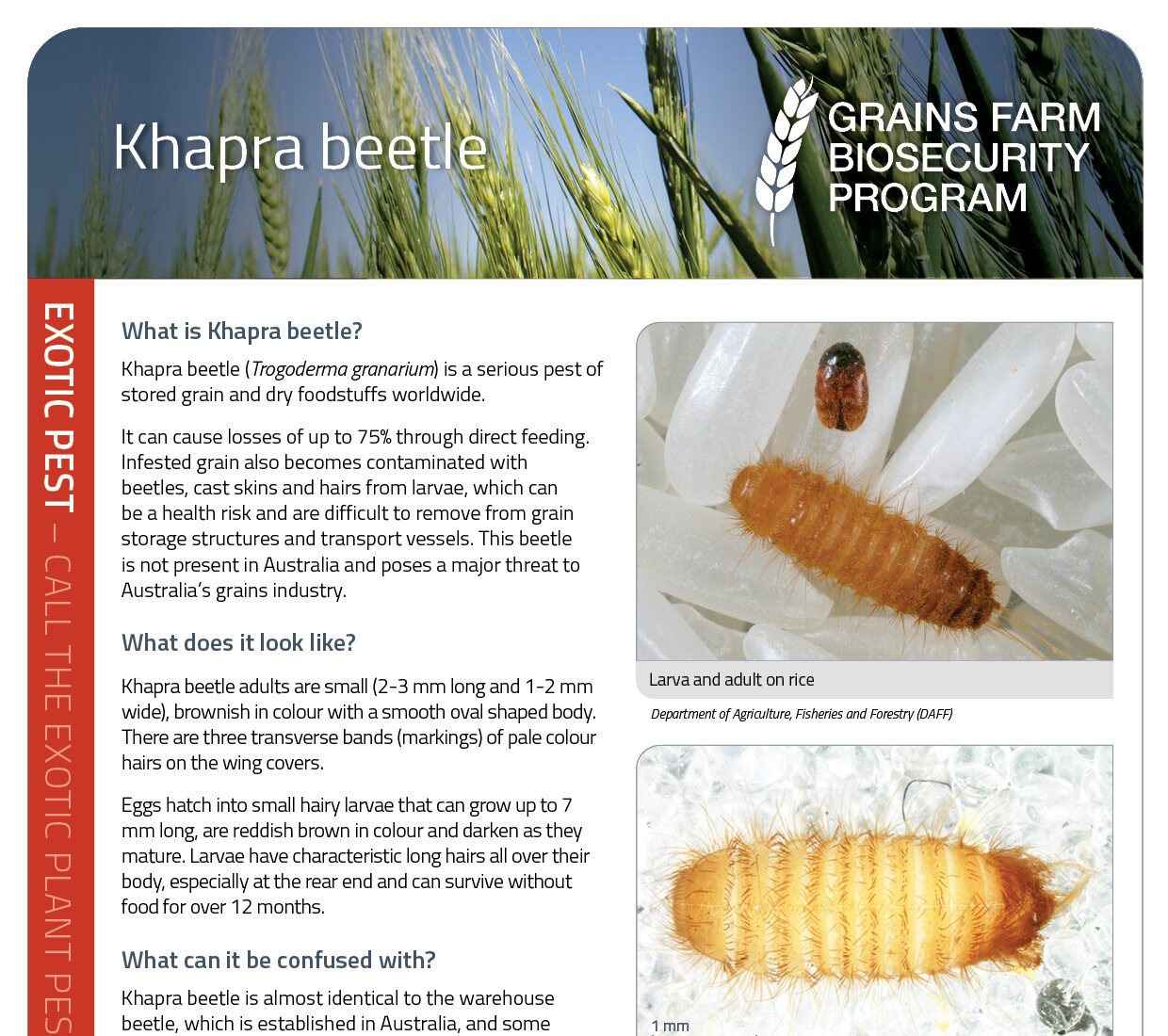 This fact sheet about khapra beetle (Trogoderma granarium) was produced for grain growers through the Grains Farm Biosecurity Program.